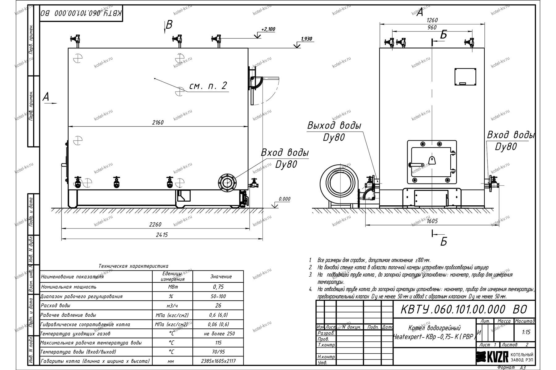 | Марка котла | Котел КВр, Котел малой мощности | Водяной объем котла, л | 570 |