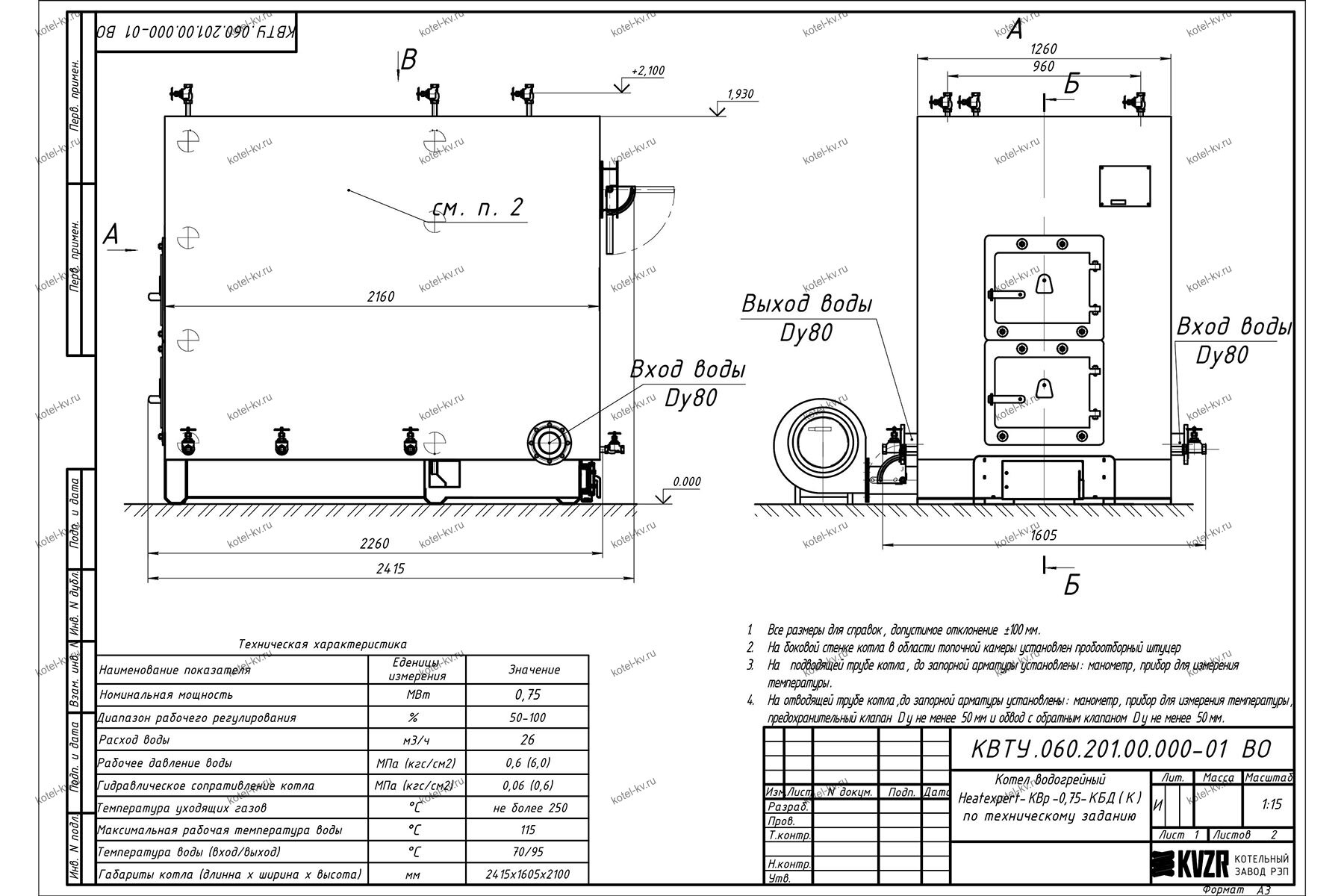 Завод производитель в г Владивосток в процессе производства и технического контроля подвергает промышленный КВр-0,75 К с колосниками гидравлическому испытанию давлением 0,9 МПа (9 кгс/см2).